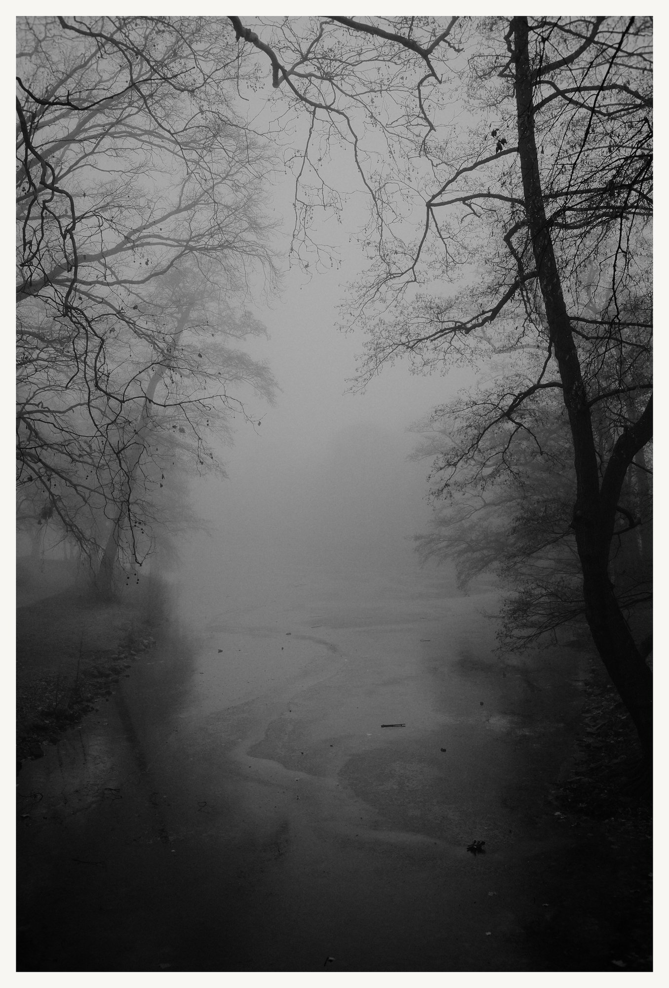 A city park in its sleep. The fog swallowed the world. The bare branches create a natural frame, leading the eye into the unknown. Sometimes, less is more..