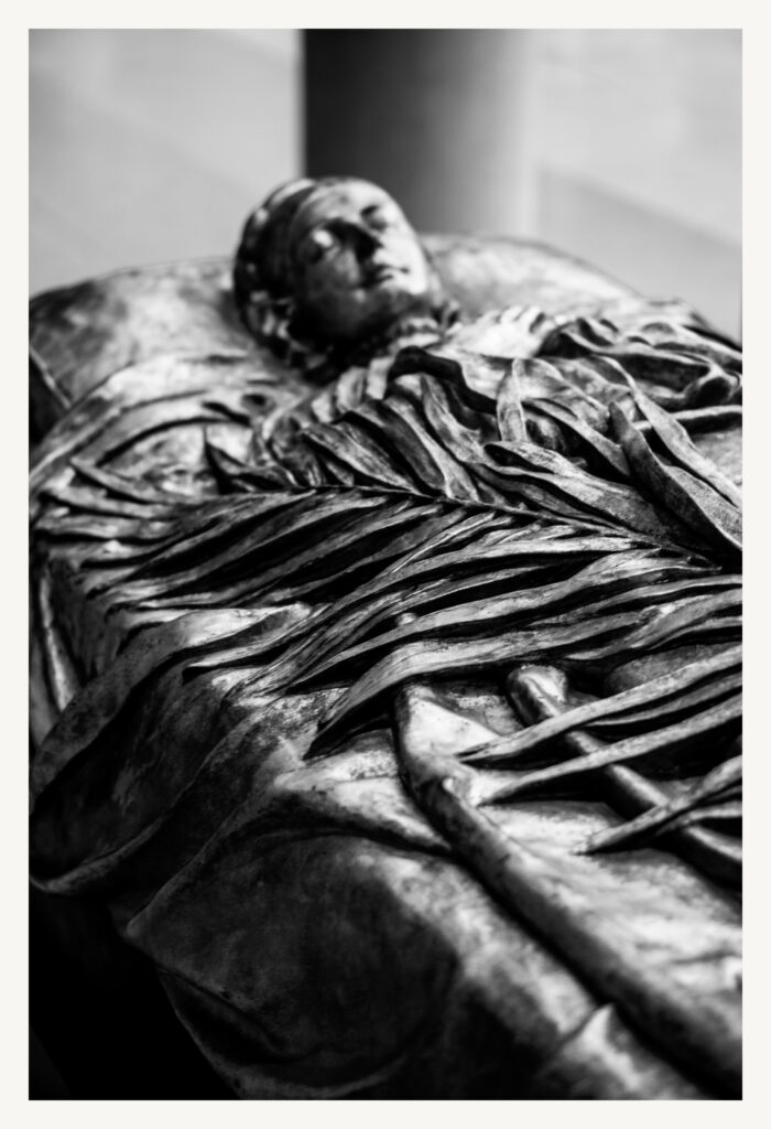 It shows Elizabeth lying peacefully with her arms folded, in the traditional style of a recumbent tomb effigy inspired by Gothic and Renaissance sculpture. A long palm branch rests across her body, symbolizing Christian victory over death and the idea that death is temporary.