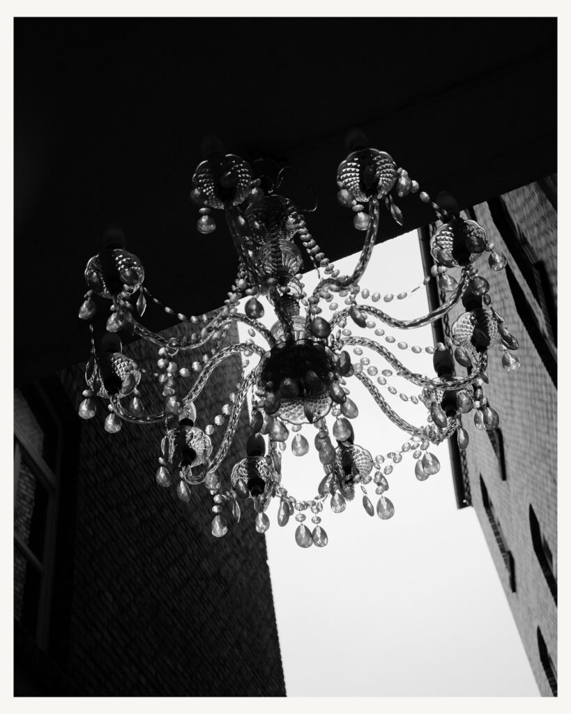 A chandelier in monochrome. Hanging between the dark and the white.